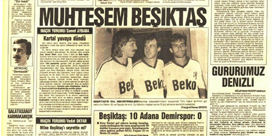90 dakika bittiğinde Adana Demirspor’un ağlarında tam 10 gol vardı. İlk yarıda 4 gol yediği için oyundan çıkarılan Adana Demirspor kalecisi Fatih’in yerine oyuna giren Haluk’un da payına 6 gol düşmüştü. Siyah-beyazlı takımımızı, bu tarihi zafere götüren gollerin 4’ünde Ali’nin 3’ünde Metin’in, 3’ünde de Feyyaz’ın başarılı atışları vardı. Üstelik Beşiktaş’ın iki penaltısı verilmemiş ve Metin’in bir şutu direkten dönmüştü. Adana Demirspor galibiyeti ile moral bulan Beşiktaş’ın bu yeni kadrosu hızlı bir yükselişe geçerek ve uzun süre lider götürmüş olduğu ligi zirvede bitirecekti. Bu aynı zamanda 3’lü şampiyonluk serisinin başlangıcıydı. Beşiktaş’ın o yılki kadrosu, “efsane kadro” adıyla tarihe adını yazdırırken, 10-0’lık maç profesyonel futbol tarihimizin hala kırılamayan rekoru olmayı sürdürmekte.